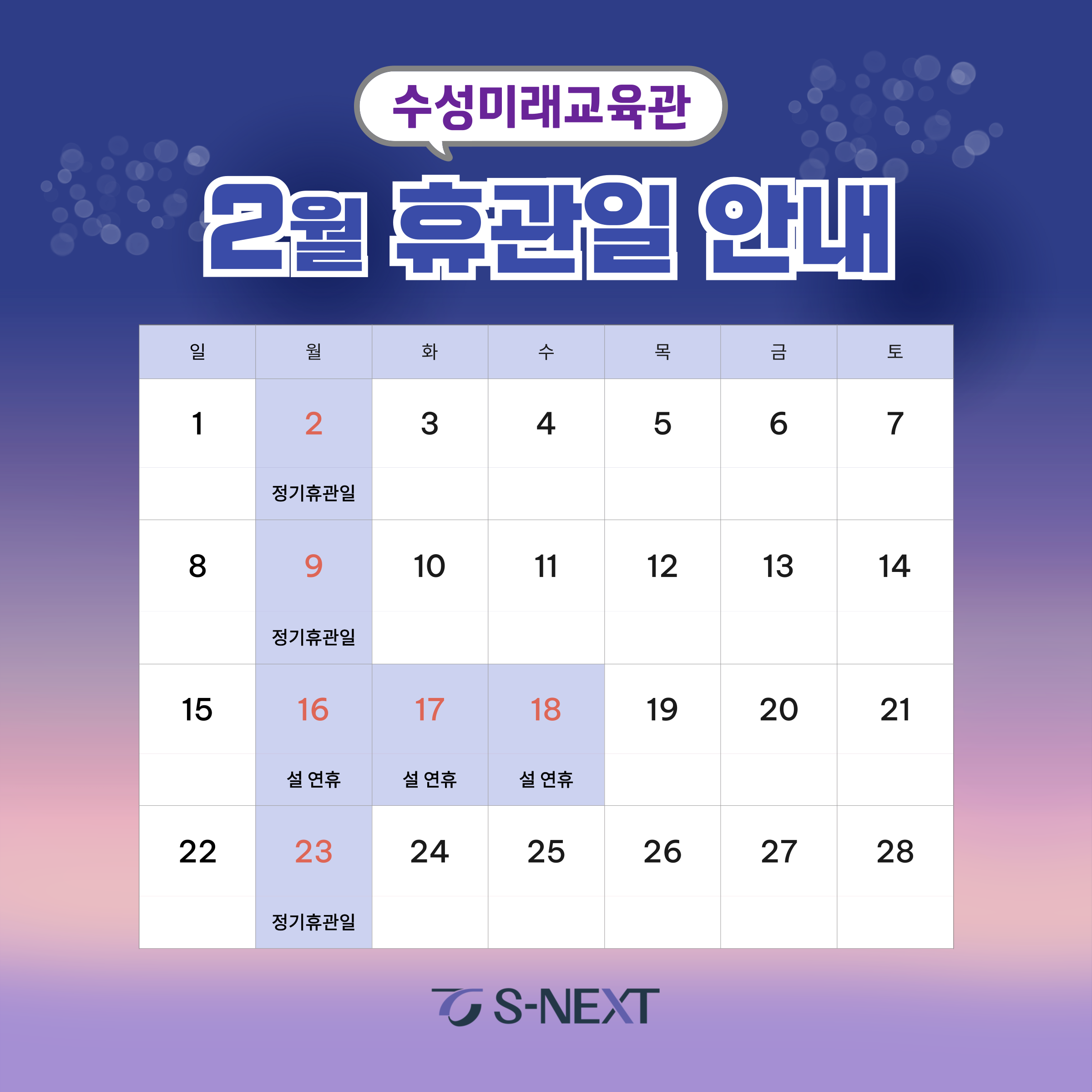 안녕하세요^^ 수성미래교육관 설 연휴 및 2월 휴관 안내 드립니다.